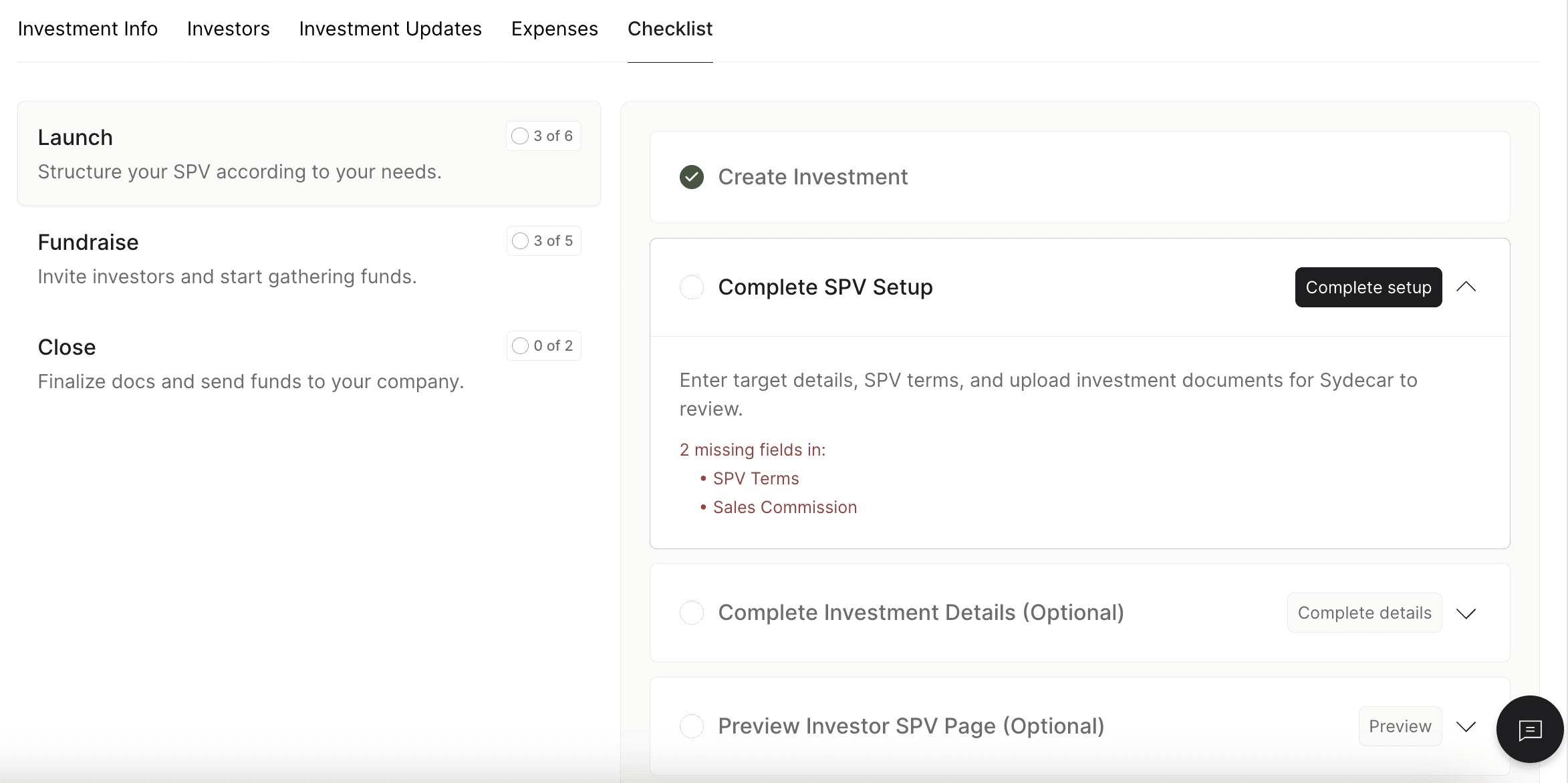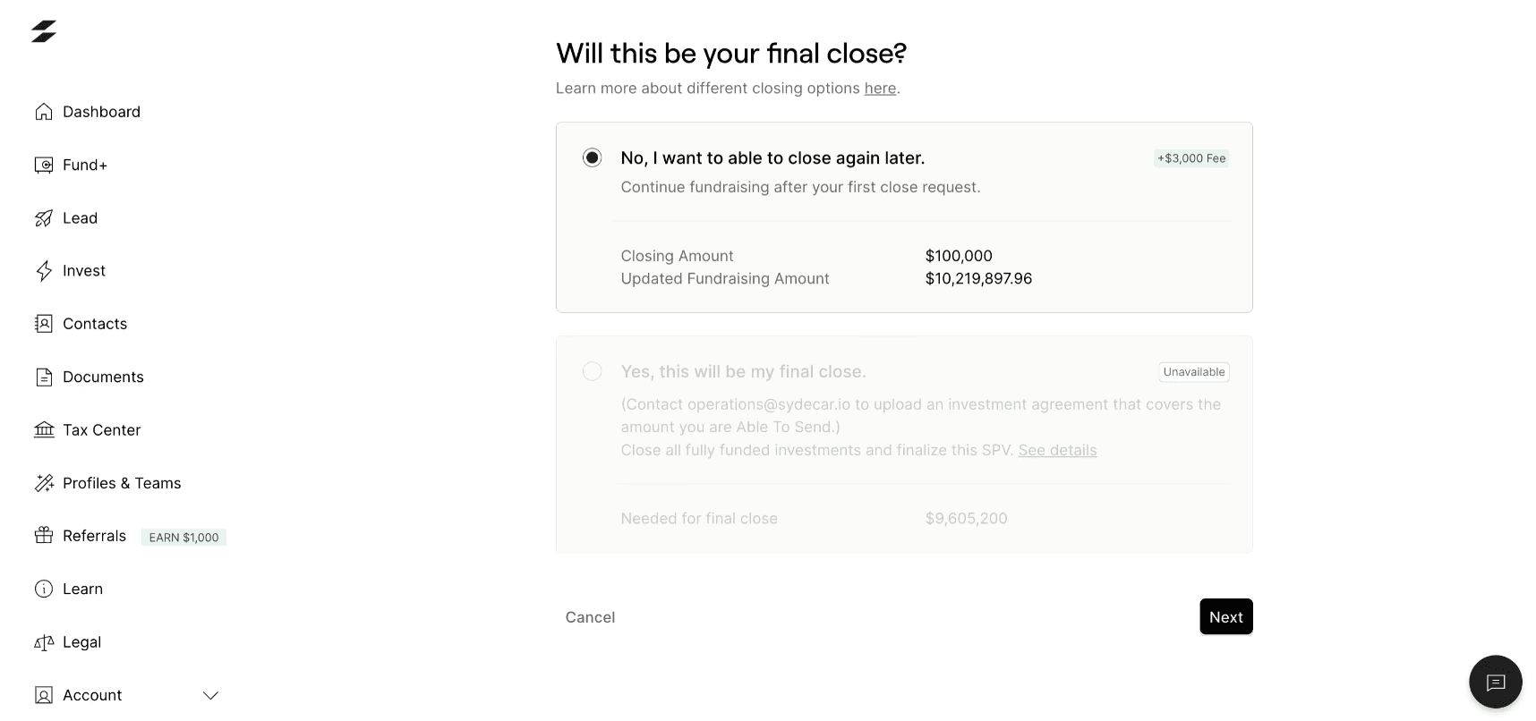 Deal Leads can now execute multiple closes for a single SPV. Instead of waiting on every commitment before funding, you can now close on the capital you’ve raised so far, and then add new or existing investors in subsequent closes. You can execute an unlimited number of closes* and maintain real-time visibility into fees, allocations, and investor status on the Sydecar platform.